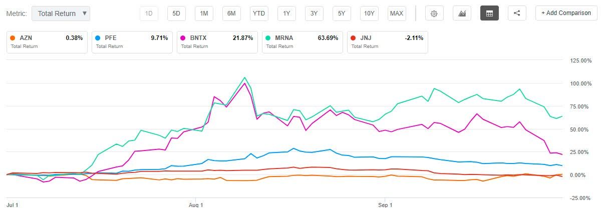 近期股价走势方面,相比于其它主流新冠疫苗生产商,阿斯利康在第三季度(2021年7月1日至9月30日)的总回报率表现并不算亮眼。