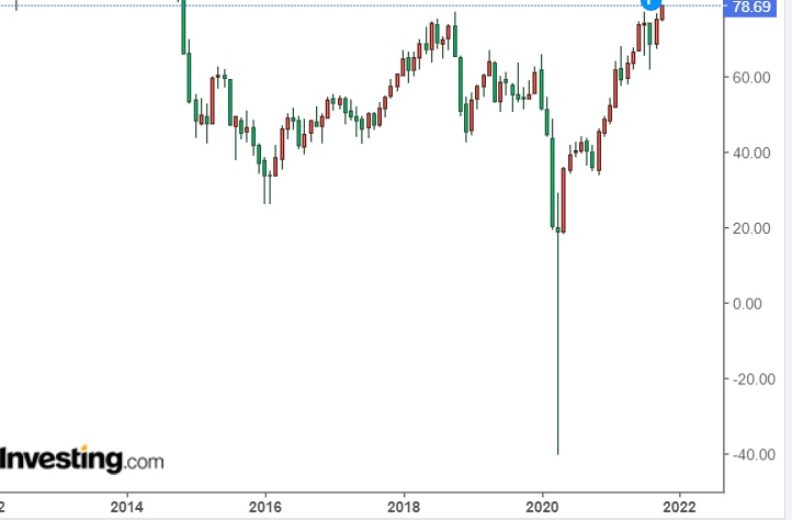 智通财经APP获悉,当前美原油价格继续稳定在自2014年以来的最高水平附近,今日WTI原油价格最高达78.88美元,截至发稿,WTI原油价格为78.83美元/桶,布伦特原油价格为82.67美元/桶。