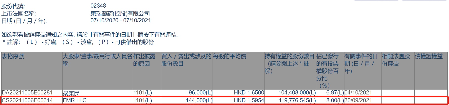 智通财经APP获悉,香港联交所最新资料显示,9月30日,FMR LLC增持东瑞制药(02348)14.4万股,每股作价1.5954港元,总金额约为22.97万港元。增持后最新持股数目约为1.20亿股,最新持股比例为8.00%。
