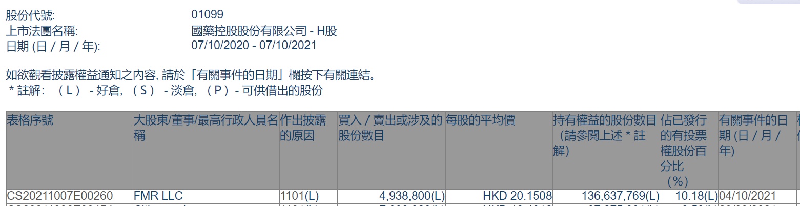 智通财经APP获悉,香港联交所最新资料显示,10月4日,FMR LLC增持国药控股(01099)493.88万股,每股作价25.1508港元,总金额约为9952.08万港元。增持后最新持股数目约为1.37亿股,最新持股比例为10.18%。