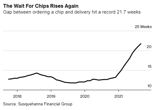 另外,有迹象表明,供应短缺危机正在恶化。根据Susquehanna Financial Group的数据显示,半导体行业的交付周期连续第九个月上升,9月份的平均交付周期为21.7周。这是该公司自2017年开始跟踪数据以来时间最长的一次。