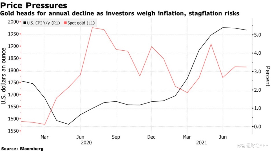从历史上看,当通胀上升时,黄金一直被视为一种有吸引力的投资。上世纪70年代末,随着美国消费者价格指数(CPI)逼近近15%的峰值,黄金价格上涨了两倍。但黄金对利率也很敏感,投资者押注央行将很快开始控制刺激措施,并推高借贷成本。这削弱了持有黄金的理由。