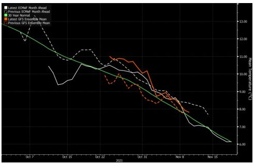 根据Weather Company数据建立的模型,欧洲西北部的天气预报显示,下周气温将低于正常水平,然后从11月8日起再次下降。另外,有报告显示,下周风力发电量将降至较低水平,在供暖需求可能增加之际,供应将受到限制。