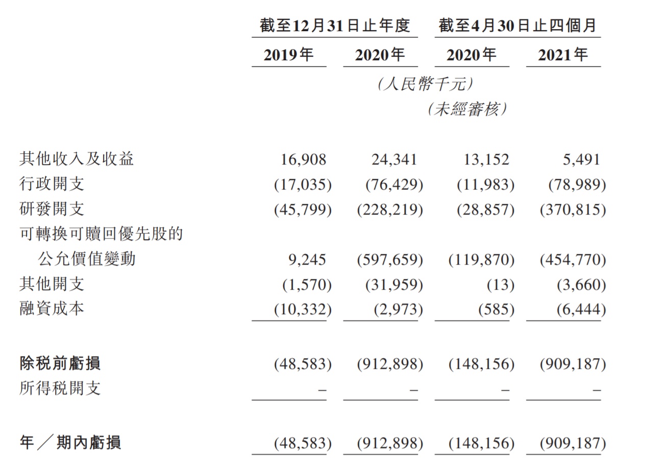 值得注意的是,该公司目前并无获准商业销售的产品,也无产生任何产品销售收益。截至2019年及2020年12月31日止年度以及截至2021年4月30日止四个月,公司的亏损总额分别为人民币4858.3万元、9.129亿元及9.092亿元。年内亏损总额主要产生自研发开支及行政开支以及可转换可赎回优先股公允价值变动。此外,公司近年获得过多次融资。2020年6月,三叶草生物制药完成1.72亿B-2轮融资,由高瓴创投投资;2021年2月,公司完成2.3亿美元C轮融资并获得超额募集,由高瓴创投和淡马锡共同领投。