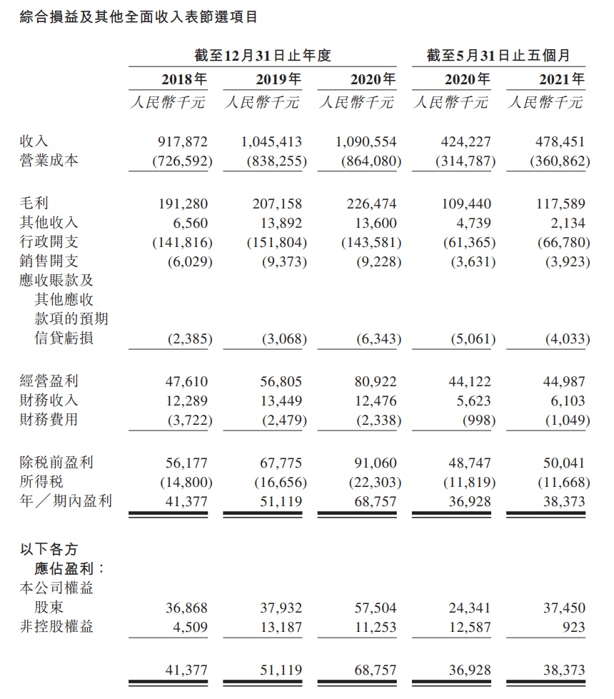 公司收入持续增加,主要由于在管建筑面积持续增加。截至2021年5月31日止五个月,公司期内盈利为人民币38.4百万元,较截至 2020年5月31日止五个月的人民币36.9百万元增加3.9%。截至2020年12月31日止年度,公司年内盈利为人民币68.8百万元,较截至2019年12月31日止年度的人民币 51.1百万元增加34.5%。有关增幅乃主要由于(i)物业管理服务收入随着住宅物业的在管建筑面积及平均物业管理费率两者的增加而有所增加,以及社区增值服务收入因公司于2020年管理额外三间食堂而有所增加;及(ii)行政开支随着2020年中国政府因应 COVID-19疫情而给予社保减免而有所减少。