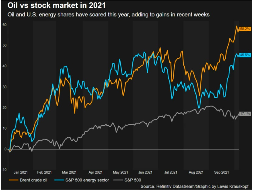 能源成本飙升是导致通胀的关键因素。在未来几周,随着美股企业第三季度业绩陆续公布,能源成本飙升将成为一个重要话题。自8月底以来,油价已飙升逾25%,布伦特原油价格突破每桶80美元,创下三年来新高,WTI原油价格则创2014年11月以来新高。