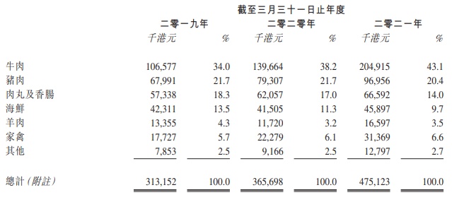 回顾2019至2021三个财年,牛肉的收入维持最大占比,其次为猪肉。几乎每项产品的收入都维持逐年上涨,总收入也同样保持增长,复合年增长率为23.2%。值得注意的是,2020财年的业绩并没有因为疫情,而出现下滑。