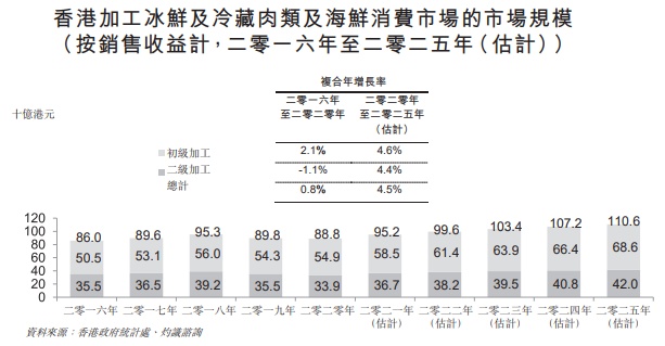 开头提到香港的食物依赖进口,这也帮助加工冰鲜和冷藏肉类以及海鲜的消费市场发展。该市场规模预计从2020年的888亿港元,增长至2025年的1106亿港元,复合年增长率为4.5%。