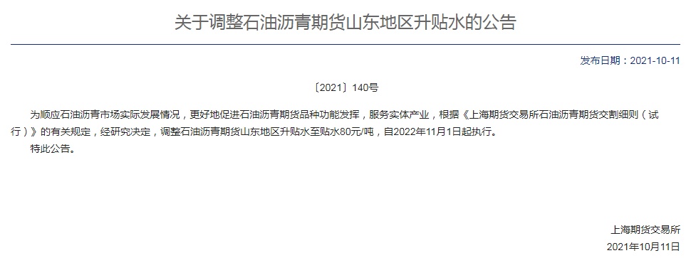 智通财经APP获悉,据上期所10月11日消息,为顺应石油沥青市场实际发展情况,更好地促进石油沥青期货品种功能发挥,服务实体产业,根据《上海期货交易所石油沥青期货交割细则(试行)》的有关规定,经研究决定,调整石油沥青期货山东地区升贴水至贴水80元/吨,自2022年11月1日起执行。