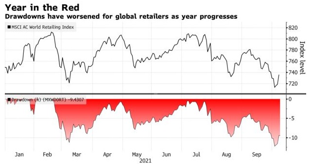 零售龙头企业3B家居(BBBY.US)的股价自6月初以来暴跌66%,反映出全球零售商面临的问题:零售商的供应链存在多个瓶颈,而此时正是它们需要为一年中最重要的假日季囤货的时候。由于一些企业下调了对销售和盈利能力的预期,该行业的一项指标今年上半年表现落后于大盘7%以上。