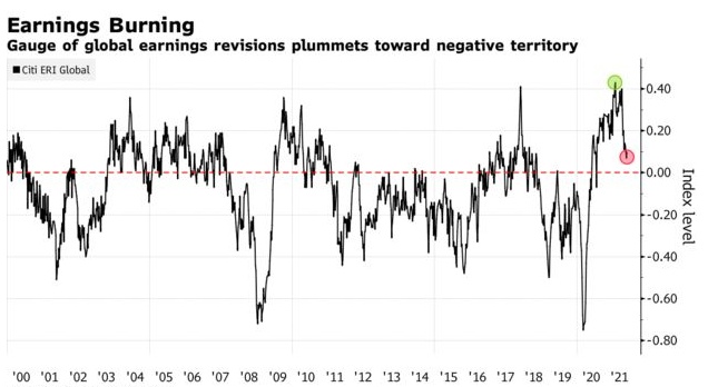 花旗集团的全球盈利修正指数在5月触及历史高位后,目前正跌向负值区间。该指数是衡量分析师上调或下调获利预期的全球性指标。