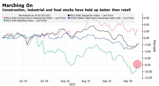 就在北美假日购物季开始之际,经济重新开放推动需求上升,但工人短缺、运输拥堵、材料成本飙升致使供应仍然短缺,这促使分析师下调了对即将到来的美股财报季的预期。由于能源危机引发了市场对通胀的担忧,投资者普遍预计供应链混乱不会在今年结束。在半导体、零售和原材料领域,投资者普遍持谨慎态度。