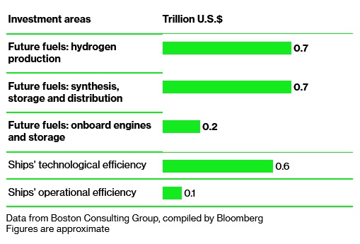 BCG预计,航运业若要实现净零碳排放,需要大约2.4万亿美元的投资,其中大约70%将用于投资清洁燃料,主要用于生产、储存和分销。