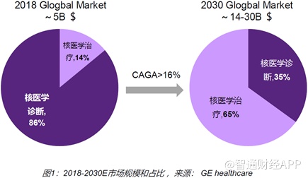 近年来,核药市场规模迅速发展。2018年全球核医学市场规模约50亿美元,其中核医学治疗市场占比约14%,核医学诊断市场占比约86%。GE healthcare预计2030年全球核医学市场规模将达到140-300亿美元,CAGR超过16%。随着多款药物上市和放量,治疗类产品在核医学市场的占比将从当前的14%上升到35%。