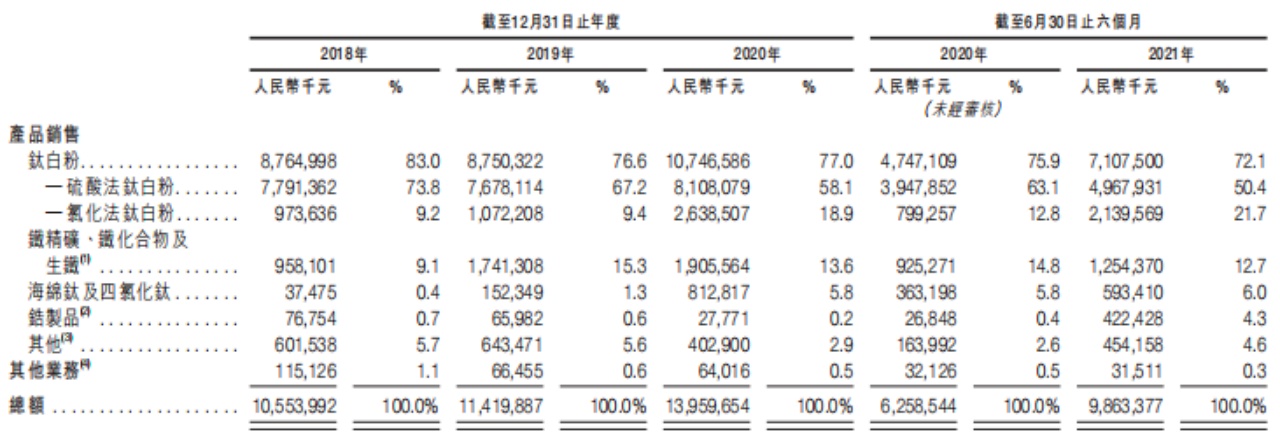 据招股书披露,龙佰集团绝大部分收益来自销售产品,而销售钛白粉的收入又占据了大头。2018年-2021年上半年,销售钛白粉产生的收入占公司总收入的比重始终在七成以上。因而,换句话说钛白粉的景气度将对龙佰集团的业绩产生决定性影响。