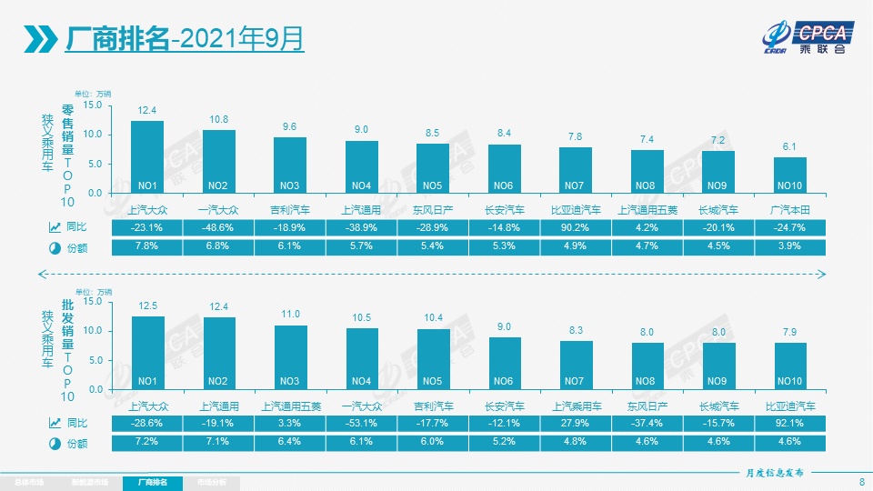 9月自主品牌零售69万辆,同比增长5%,环比8月增长16%,相对2019年9月增长6%。自主品牌国内零售份额为44.3%,同比增9.4个百分点。批发市场份额47.7%,较同期份额增长11个百分点。且自主品牌头部企业产业链韧性强、有效化解芯片短缺压力,变不利为有利,在新能源获得明显增量,因此比亚迪、上汽乘用车等传统车企品牌同比均呈高幅增长。