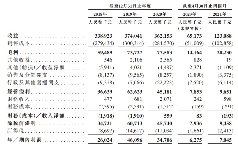 截至2018年、2019年及2020年12月31日止年度与截至2020年及2021年4月30日止四个月,公司的收益分别约为人民币3.39亿元、约人民币3.74亿元、约人民币3.62亿元、人民币6517.3万元、约人民币1.23亿元。