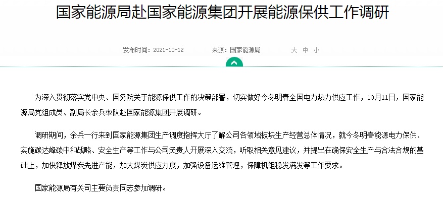 智通财经APP获悉,10月11日,国家能源局党组成员、副局长余兵率队赴国家能源集团开展调研。调研期间,余兵一行来到国家能源集团生产调度指挥大厅了解公司各领域板块生产经营总体情况,就今冬明春能源电力保供、实施碳达峰碳中和战略、安全生产等工作与公司负责人开展深入交流,听取相关意见建议,并提出在确保安全生产与合法合规的基础上,加快释放煤炭先进产能,加大煤炭供应力度,加强设备运维管理,保障机组稳发满发等工作要求。