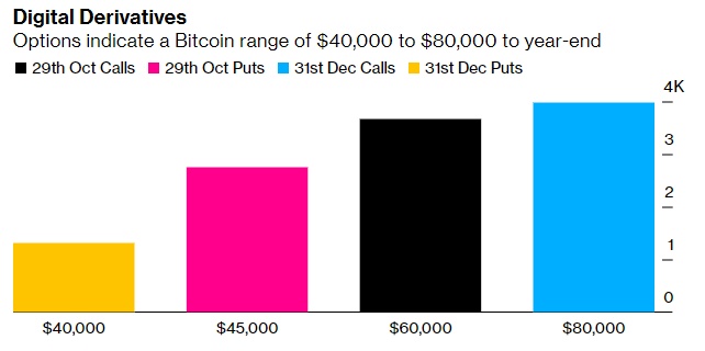期权市场的定位表明市场押注比特币继续上涨。根据期权交易所Deribit的数据,2021年12月到期的8万美元行使价看涨期权的持仓量远远超过4万美元行使价看跌期权的持仓量。