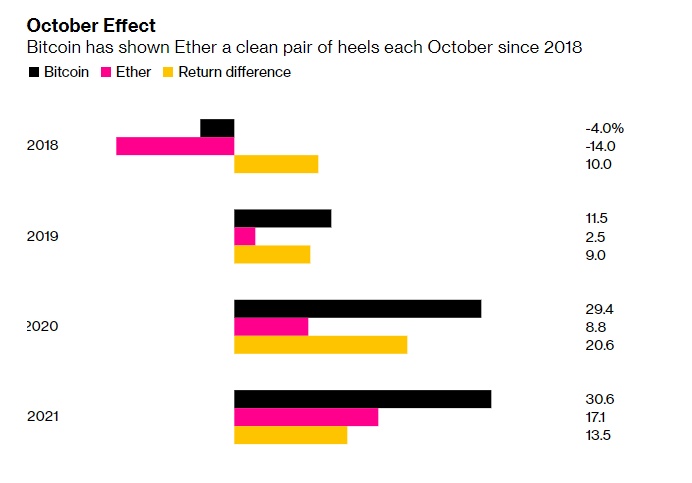 比特币在2018年、2019年和2020年这三年10月的表现均优于以太币,并于本月再次保持这种势头。在过去三年里,比特币在10月份平均领先以太币约13个百分点。