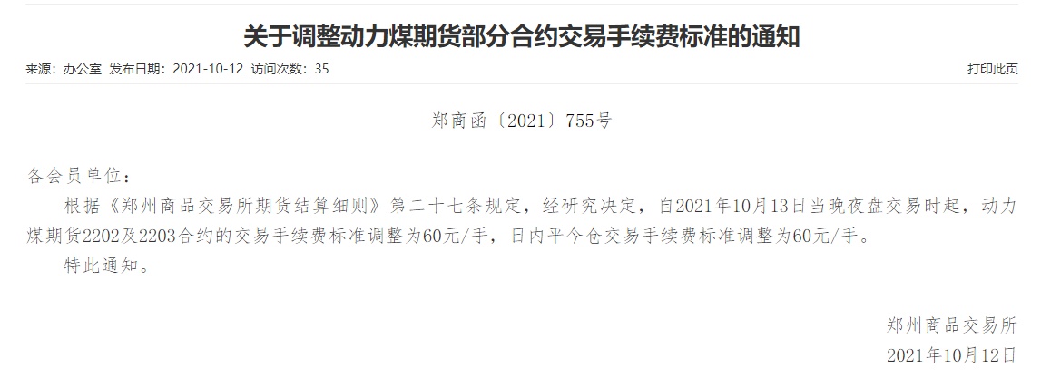 智通财经APP获悉,据郑商所10月12日消息,郑商所决定自2021年10月13日当晚夜盘交易时起,将动力煤期货2202及2203合约的交易手续费标准调整为60元/手,日内平今仓交易手续费标准调整为60元/手。