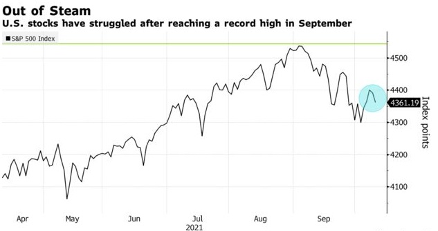 在超宽松货币政策和财政政策的推动下,美国和欧洲股市连续六个季度上涨,但近几周来涨势逐渐减弱。标普500指数较上月创下的纪录高点下跌近4%,通胀飙升、taper临近、能源危机和对经济放缓的担忧打压了市场信心。