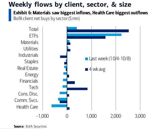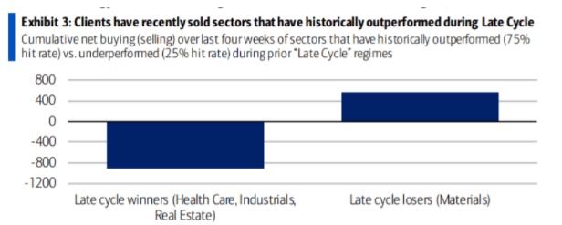 对材料的净买入表明,投资者尚未认为经济处于后期阶段的复苏。他们表示:“通常在经济复苏周期的中期转向后期的阶段,房地产、工业和医疗保健类股通常表现最好,而材料类股表现最差。”“但上述最近的资金流显示,客户并没有转向后期阶段表现较好的板块。”