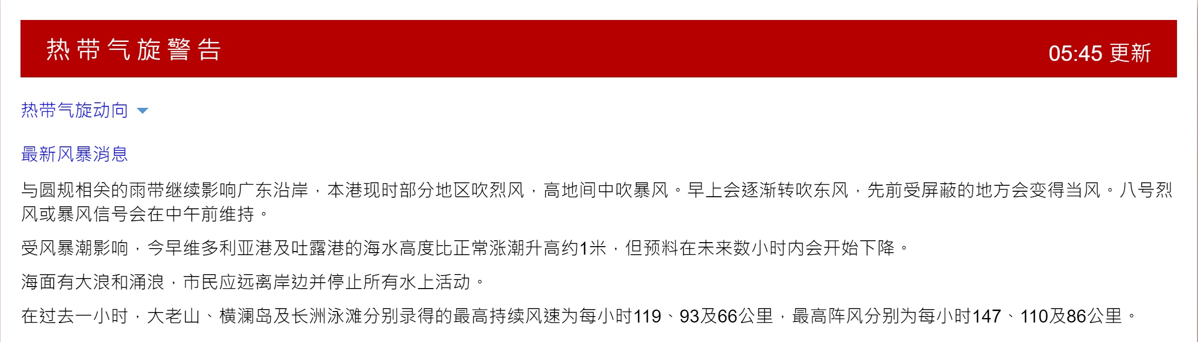 香港天文台:八号烈风或暴风信号会在中午前维持