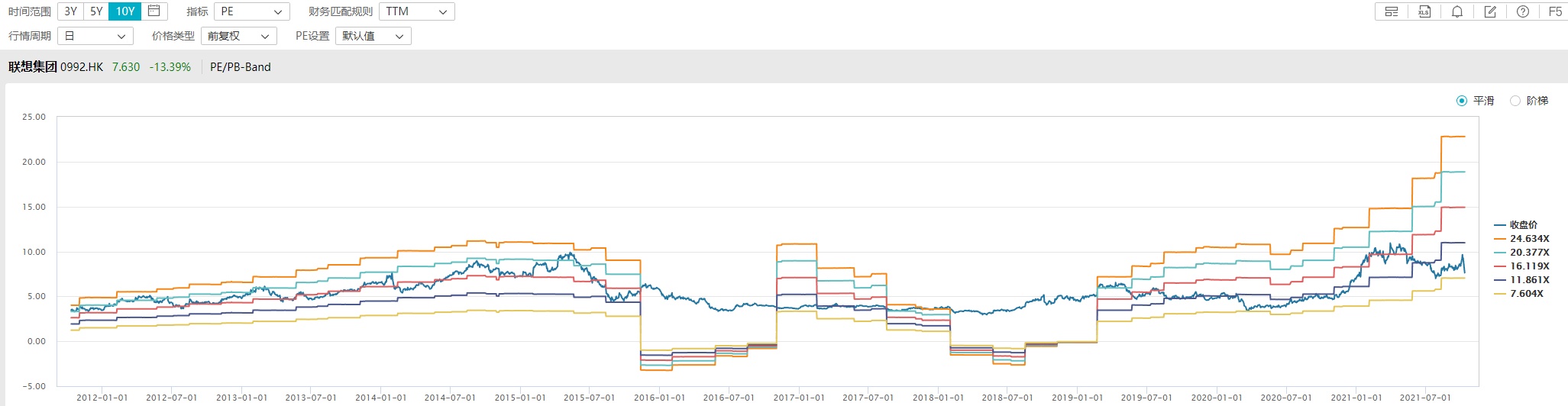 首先就估值来看,回溯联想集团过去10年的估值水平,可以看到公司市盈率均值在16倍左右,但在经历了短期非理性的向下调整后,公司当前股价已接近估值下轨的7.6倍。考虑到联想集团第一财季的业绩已超乎外界预期,公司最终全年业绩料将维持在较高增速的水准,在此背景下联想集团当前的估值可谓处于极度低估区域。从估值角度出发,在当前股价下,联想集团已经具备较高的配置价值。