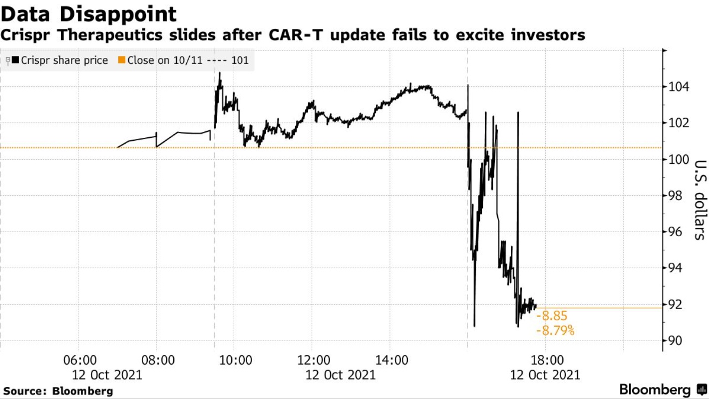 Therapeutics(CRSP.US)美股盘后跌7.79%,该公司一款试验性的血癌疗法让投资者感到失望,而在CRISPR结果公布之前,木头姐旗下方舟投资管理公司(ARK