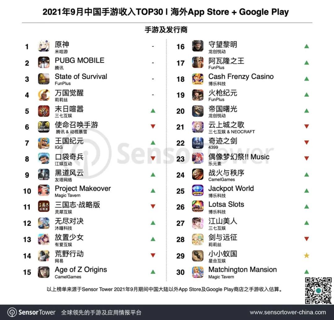 龙创悦动《守望黎明》9月海外收入环比增长27.4%,排名前进7位至第16名。过去两年,随着数款末日题材手游大作陆续上市,该题材在海外市场的收入增长了167%,并成为2021上半年海外收入最高的题材。星合互娱SLG手游《小小蚁国》本期收入环比增长7.1%,首次入围榜单第29名,使得收入榜中的手游题材进一步多元化。