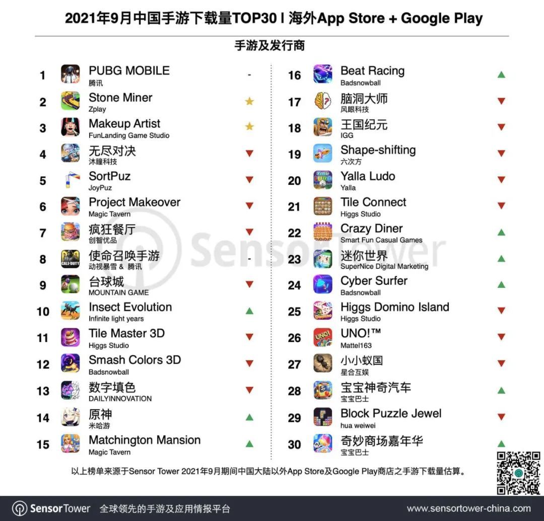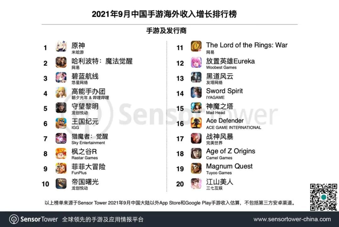 收入增量方面,9月米哈游《原神》移动端海外收入相较8月增长1.25亿美元,位列增长榜榜首。在成功打入中国iOS手游畅销榜头部的同时,网易(09999)(NTES.US)《哈利波特:魔法觉醒》手游在中国港澳台应用市场上市,并跻身增长榜第2名。继6月底在日本上市后,二次元手游《高能手办团》在9月中旬由哔哩哔哩(09626)(BILI.US)发行至韩国市场,位列增长榜第4名。