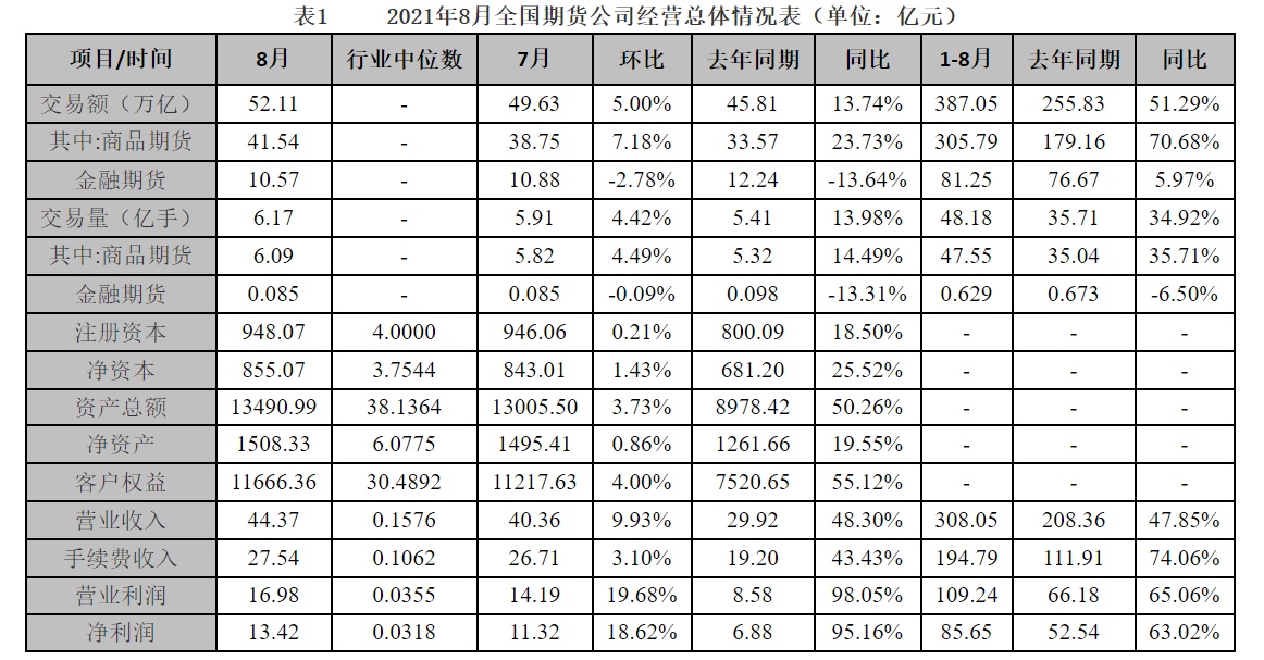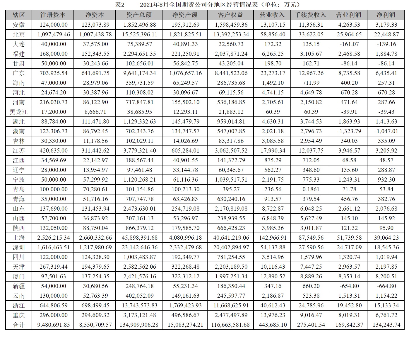 截至2021年8月末,全国共有150家期货公司,分布在31个辖区。2021年8月交易额52.11万亿元,交易量6.17亿手,营业收入44.37亿元,净利润13.42亿元。