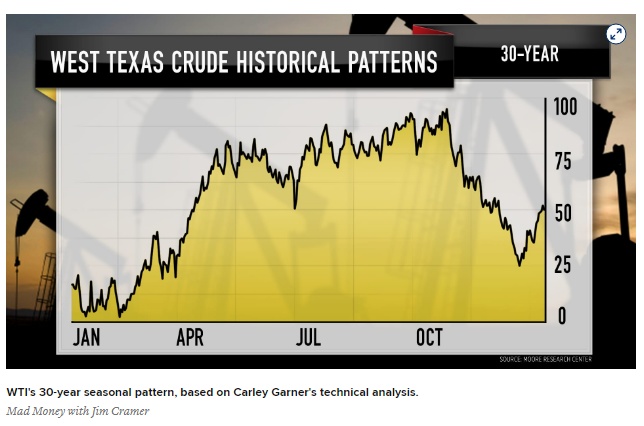 Cramer称,Garner还认为季节性趋势暗示油价涨势可能碰壁并逆转,他指的是Garner发布的一份图表,该图表显示了过去30年油价的季节性表现。