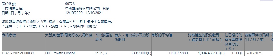 智通财经APP获悉,香港联交所最新资料显示,10月7日,GIC Private Limited增持中国电信(00728)268.2万股,每股作价2.5999港元,总金额约为697.29万港元。增持后最新持股数目约为18.04亿股,最新持股比例为13%。
