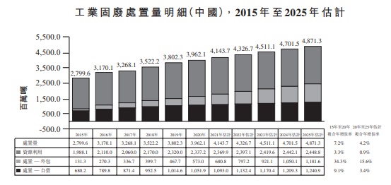 我国工业固废处置量从2015年的8.12亿吨增加至2020年的16.25亿吨,复合年增长率达到14.9%。预计2025年将继续增加至24.23亿吨,2020至2025的复合年增长率为8.3%。