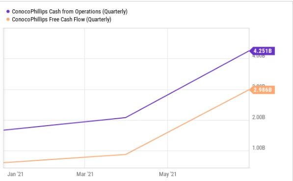 康菲在第二季度的营运现金流超过40亿美元,而自由现金流达到了30亿美元,尽管但是当时每桶石油价格平均仅为50美元。随着油价来到较高的位置,该公司的盈利很大可能会在第三季度和第四季度中继续飙升,因此康菲的自由现金流在今年下半年可能会相当强劲。
