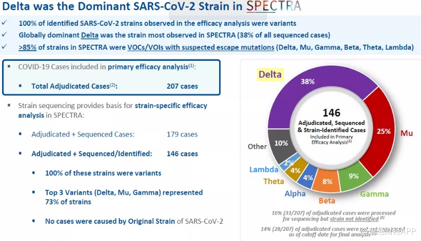 因此,此次2/3期临床在南美洲、亚洲、非洲、欧洲共入组超30000例,以南美洲和亚洲国家为主。所有测序确认的146例感染者均为突变株,其中Delta突变株占到38%,Mu突变株占25%。