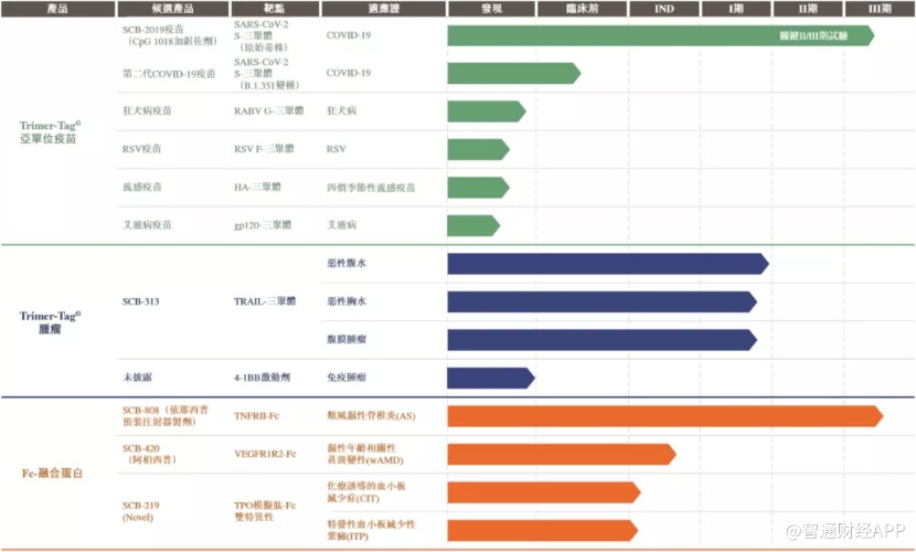 智通财经APP了解到,三叶草生物利用其专有的Trimer-Tag©(蛋白质三聚体化)技术平台,并凭借其自有生物制剂生产基础设施及能力,已建立起丰富的产品管线。除了上文提到的SCB-2019外,公司产品管线还有5种Trimer-Tag©亚单位候选疫苗,两种Trimer-Tag©肿瘤候选药物,以及三种Fc融合候选产品,涵盖13种适应症。