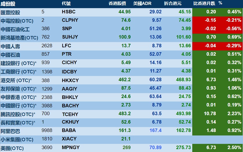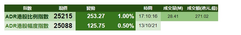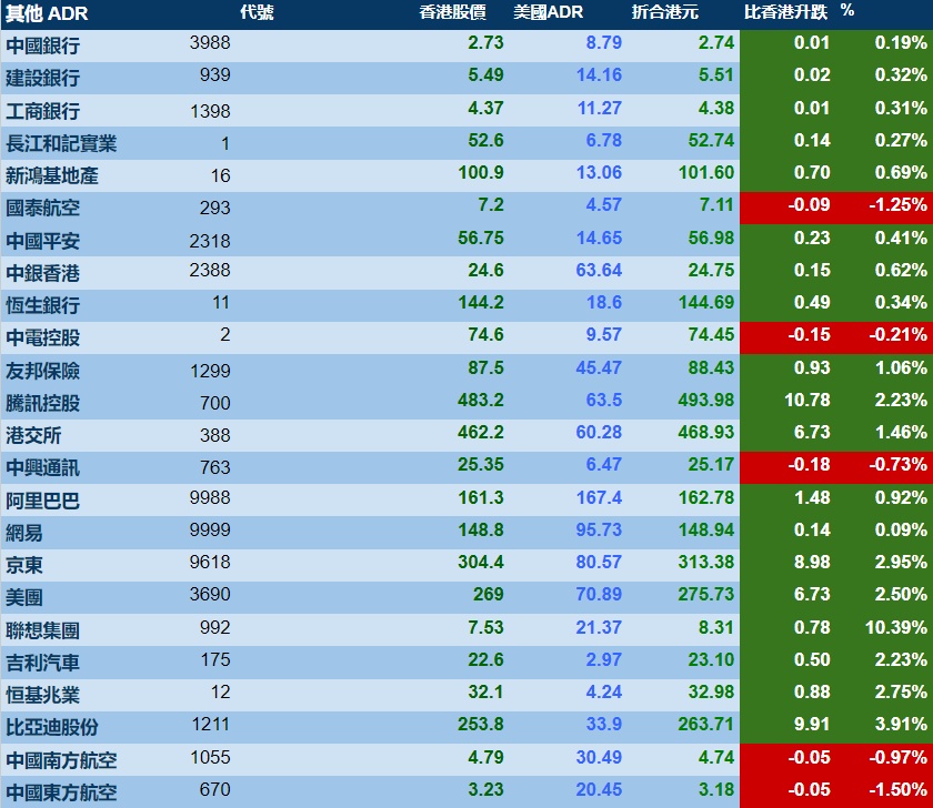 智通财经APP获悉,周三美股三大指数涨跌不一,港股ADR指数上涨,按比例计算,收报25215点,涨253.27点或1.00%。