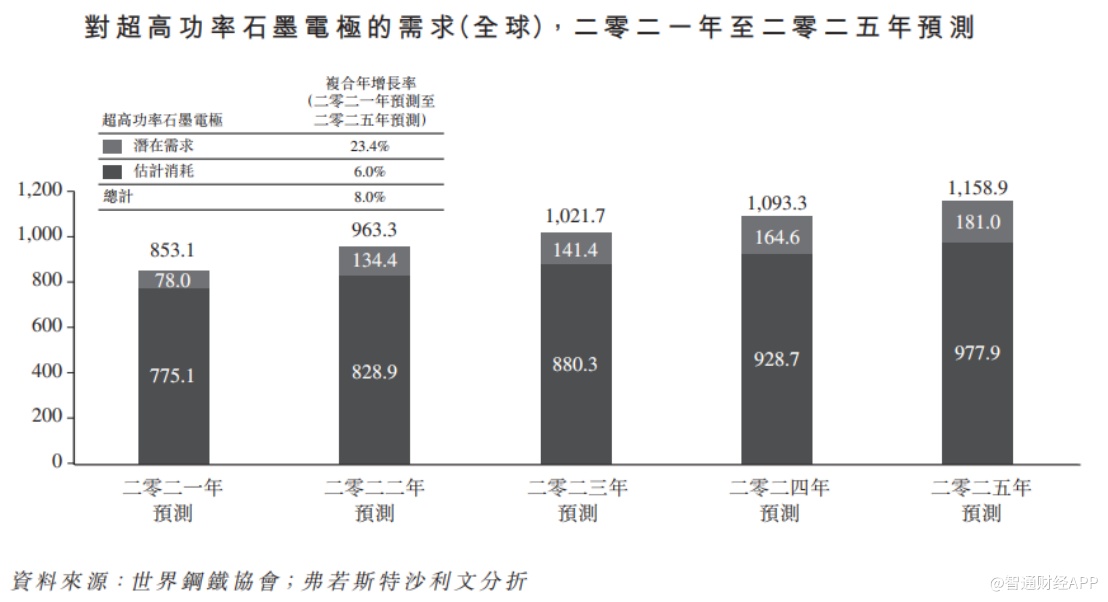 弗若斯特沙利文表示,中国电弧炉钢工业处于快速发展期,中国对石墨电极的需求预计将迅速增加,中国的石墨电极供应不能完全满足中国及中国以外国家的需求。从2021年到2025年,其他国家无法满足的超高功率石墨电极的潜在需求预计将从7.8万吨增加到18.1万吨,复合年增长率为23.4%。此外,预计2021至2025年期间,全球超高功率石墨电极的消耗及潜在需求总量将持续超过全球产量,其中差异将从2021年的7,020吨增加到2025年的1.71万吨。在此情况下,若干中国制造商正计划扩大产能,以满足其他国家的需求。