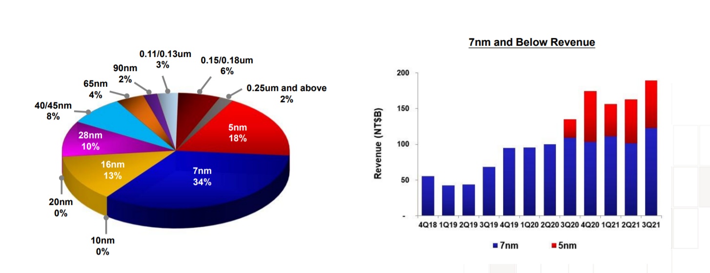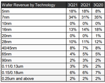 其中,按工艺制程划分,第三季度5纳米晶圆营收占晶圆总营收的18%,与上一季度持平;7纳米占34%,上一季度为31%。先进制程(7纳米及以上)的营收占比达到第三季度晶圆总营收的52%。