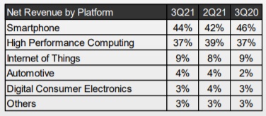 按平台划分,智能手机平台占营收比为44%,环比上升2个百分点;高性能计算(HPC)平台占营收比为37%,环比下降2个百分点;汽车平台占营收比为4%,与上季度持平。
