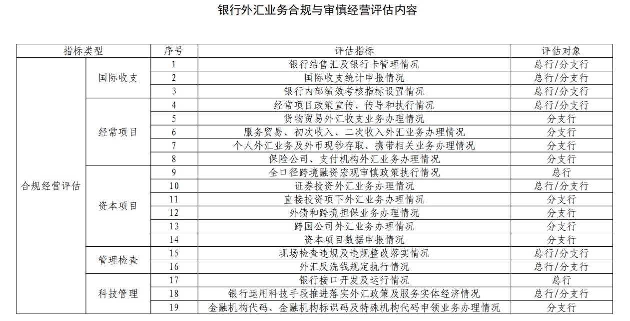 根据外汇管理规定变化和调整情况,国家外汇管理局制定了《银行外汇业务合规与审慎经营评估内容》(以下简称《评估内容》,见附件)。现就有关情况通知如下: