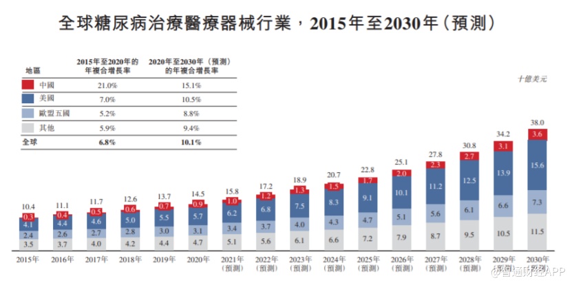 庞大的未满足治疗需求也造就了日益增长的糖尿病器械市场规模。2020年全球糖尿病器械市场规模达到145亿美元,预计到2030年,这一市场规模将增至380亿美元,约合2455亿元人民币,复合增长率达到10.1%。