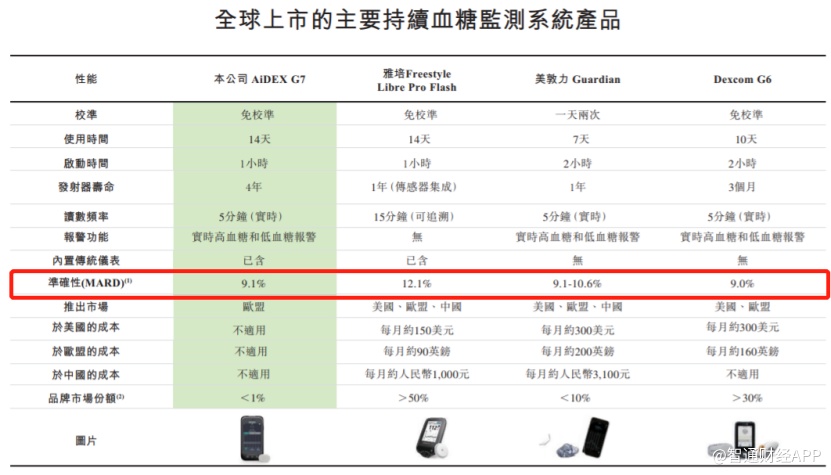 据了解,微泰医疗的AiDEX G7是全球有望第二个实现商业化的免校准(不用扎手指)、实时持续(持续14天)葡萄糖监测系统。从已发表的数据来看,AiDEX G7已显示出相比传统血糖监测系统的各种优势,具有实时监测、降低高/低血糖风险及提高对治疗方案的依从性(无需通过常规指血测量)等特点,其准确度MARD为9.1%,产品性能超过雅培同类型产品,比肩行业标杆产品德康G6。