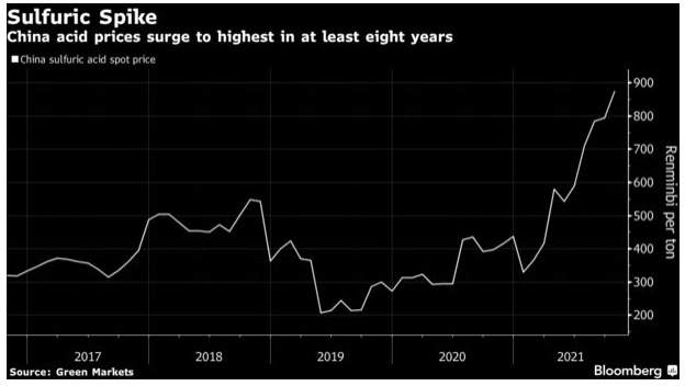 另外,物流中断和通货膨胀的另一个影响是全球对某些采矿作业中使用硫酸的挤压,目前硫酸价格处于至少2013年以来的最高水平。