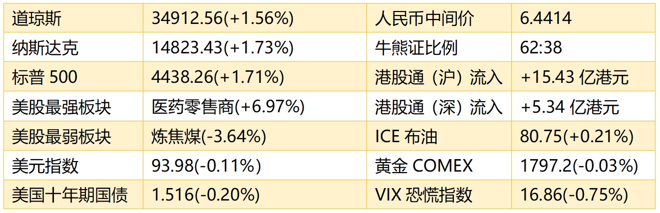 1、 隔夜美股截至收盘,道指涨534.75点或1.56%,报34912.56点;纳指涨251.79点或1.73%,报14823.43点;标普500指数涨74.46点或1.71%,报4438.26点。港股ADR指数上涨,按比例计算,收报25159点,涨196.86点或0.78%。