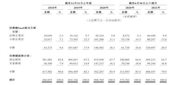 2018年、2019年及2020年以及截至2021年6月30日止六个月,供应链SaaS解决方案所得收入分别为4330万元、1.08亿元、1.47亿元及1.21亿元,其中2018年至2020年的复合年增长率为84.0%。除了理想的收入增长,供应链SaaS解决方案分部也有着较高的毛利率水平。2018年、2019年及2020年以及截至2021年6月30日止六个月,供应链SaaS解决方案毛利率分别为92.9%、92.5%、94.3%以及95.3%。