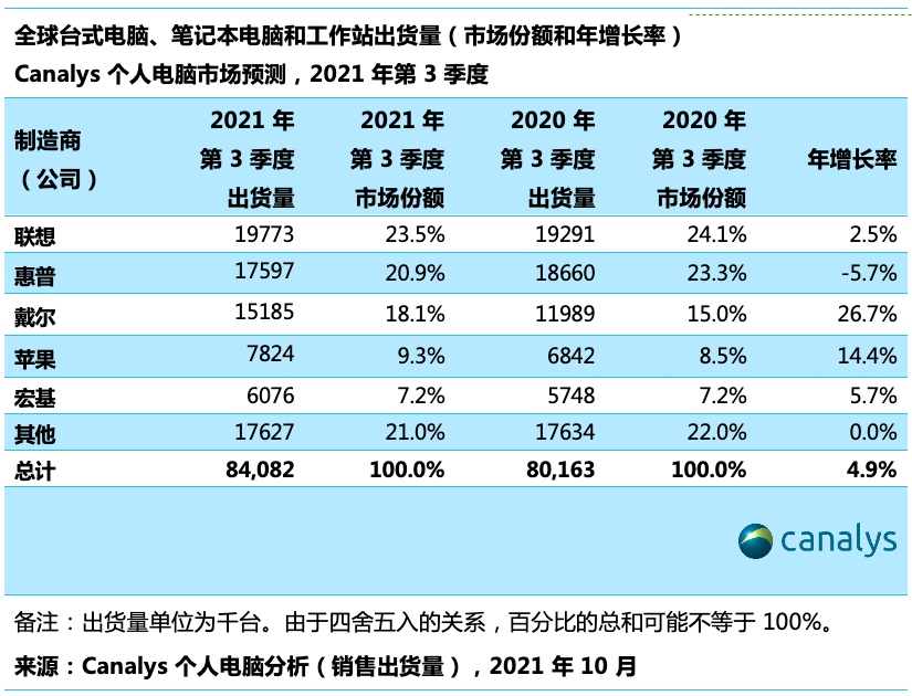 在排名前五的个人电脑厂商中,除一家以外,其余厂商的出货量都在2021年第3季度继续增长。联想以1980万台的出货量领衔市场,同比小幅增长2.5%。惠普位居第二,但出货量下降了5.7%,其中主要原因是供应美国的Chromebook的出货量下降。排在第三位的戴尔是大赢家,出货量超过1500万台,同比增长率最高,达26.7%,且市场份额增长相比去年上升超过3%。苹果和宏基分别以14.4%和5.7%的正常增长位居第四和第五,前者的市场份额也有所增长。
